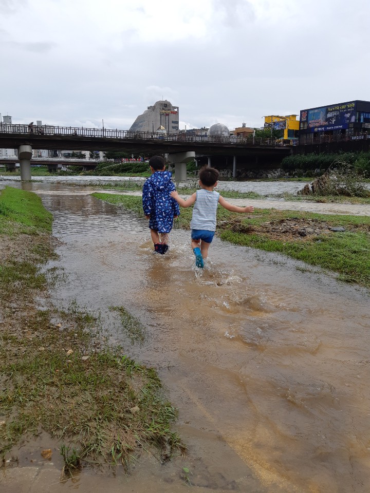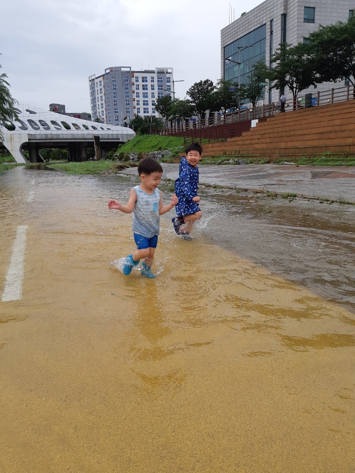 도로 까지 넘쳐흐르는 빗물이 신기한 놀잇감일 뿐이다