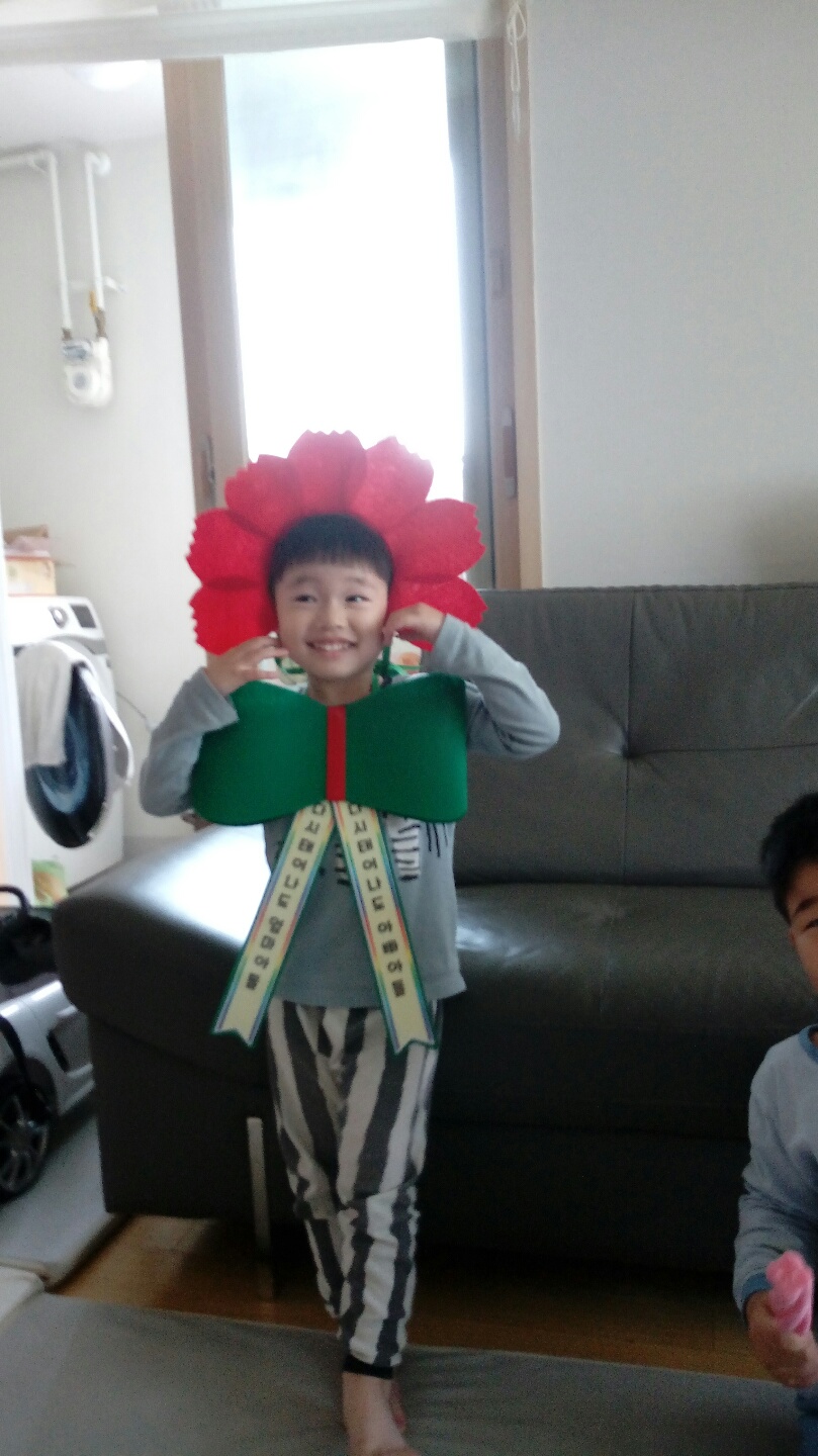 재민이가 어버이날에 어린이집에서 소품을 가져왔다